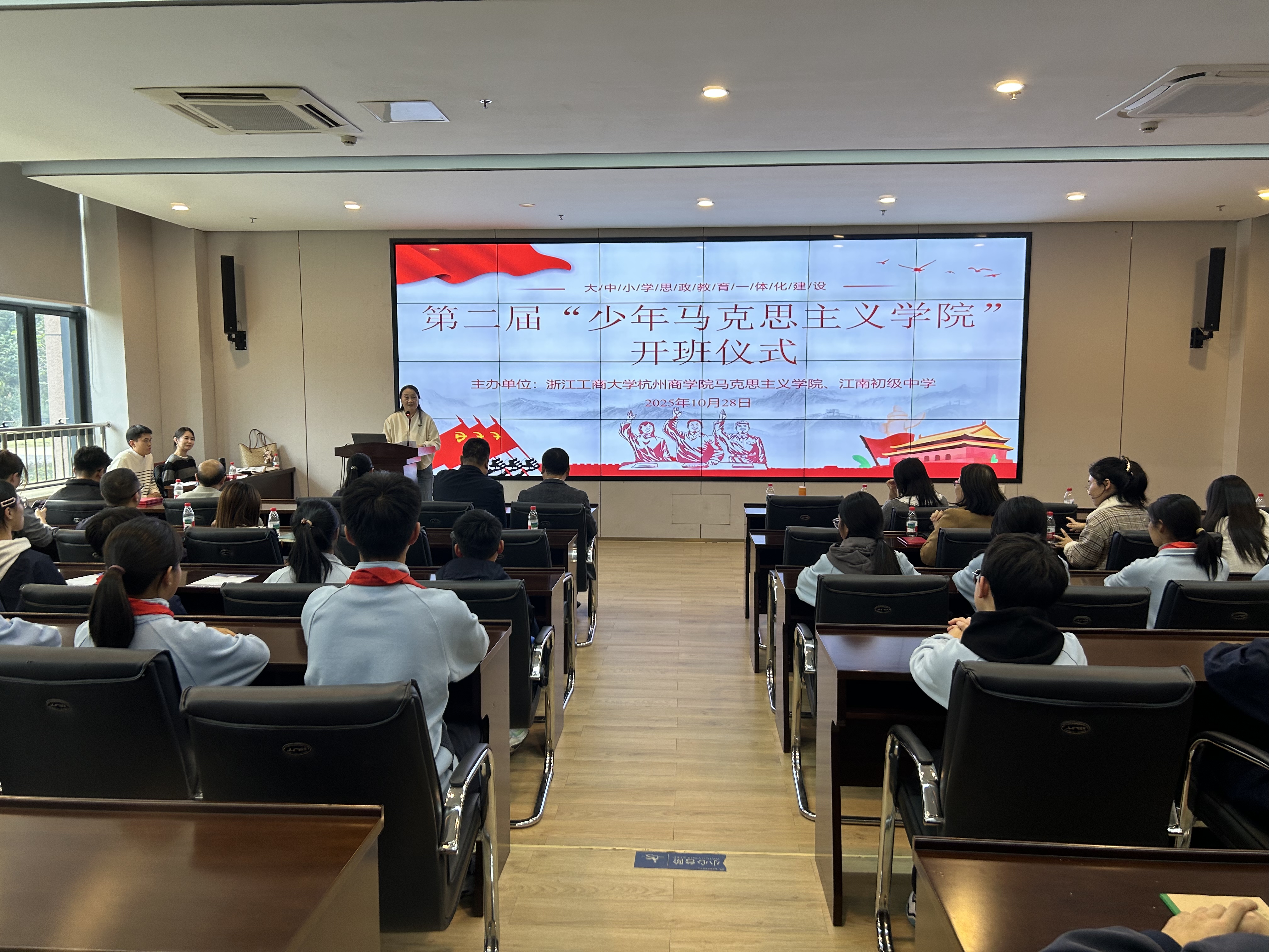 为全面落实立德树人根本任务,坚持用习近平新时代中国特色社会主义思想铸魂育人,推动思政课建设内涵式发展。2025年10月28日下午,浙江工商大学杭州商学院马克思主义学院联合桐庐县江南初级中学在图书馆T104举办第二届“少年马克思主义学院”开班仪式。两校相关领导、师生代表出席仪式,实验初中教育共同体师生代表应邀参加,共同见证这一重要时刻。