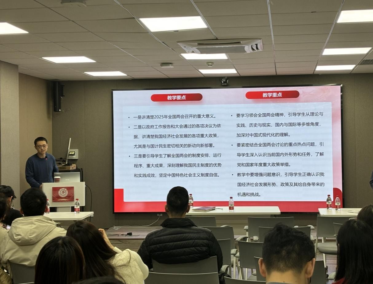 形势与政策课专题展示环节,马克思主义学院青年教师侯冠华以“从两会蓝图到青年担当:2025中国高质量发展的机遇与责任”为主题,为任课教师作了精彩的教学展示,展望了2025年两会政策议题,探讨了青年在新时代背景下的责任与担当。