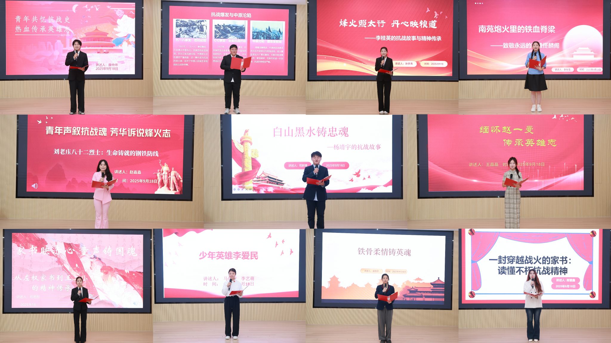 本次活动自启动以来,始终以“学史明理、学史增信、学史崇德、学史力行”为指导思想,由教务处与马克思主义学院联合策划、共同推进。活动前期,全校学生围绕抗战主题深入挖掘历史素材,严格按照要求完成讲述稿撰写与PPT制作。活动组委会则有序开展工作,通过初赛作品收集与初评、半决赛院内展示等环节层层筛选,最终从众多作品中选出11组优秀学生作品,进入决赛现场展示环节。