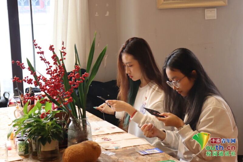 图为实践队成员体验珠绣技艺。李佳晨 供图