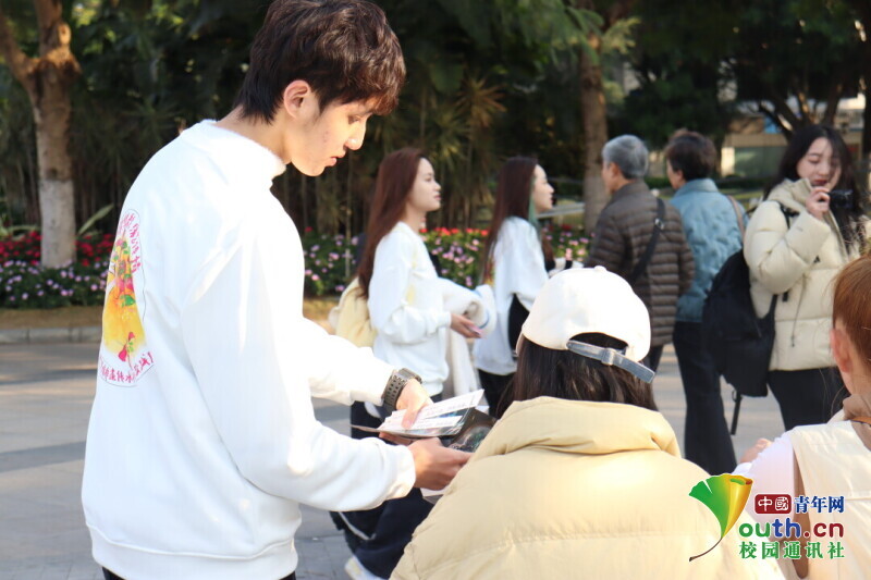 图为实践队成员分发珠绣宣传手册。李佳晨 供图