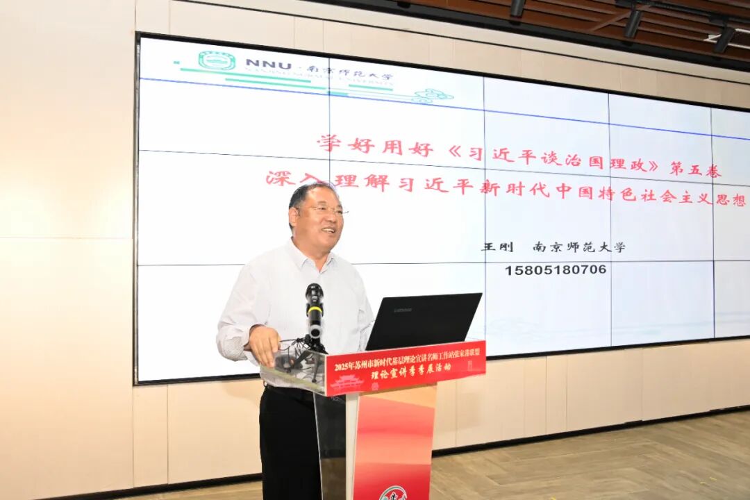 南京师范大学马克思主义学院调研组一行实地观摩了在乐余镇新时代文明实践所举办的2025年苏州新时代理论宣讲名师工作站张家港联盟理论宣讲季季展活动。南京师范大学马克思主义学院原院长王刚进行宣讲,以通俗语言传递高深理论和国家治理智慧,为基层宣讲员做了一堂生动的理论宣讲示范。