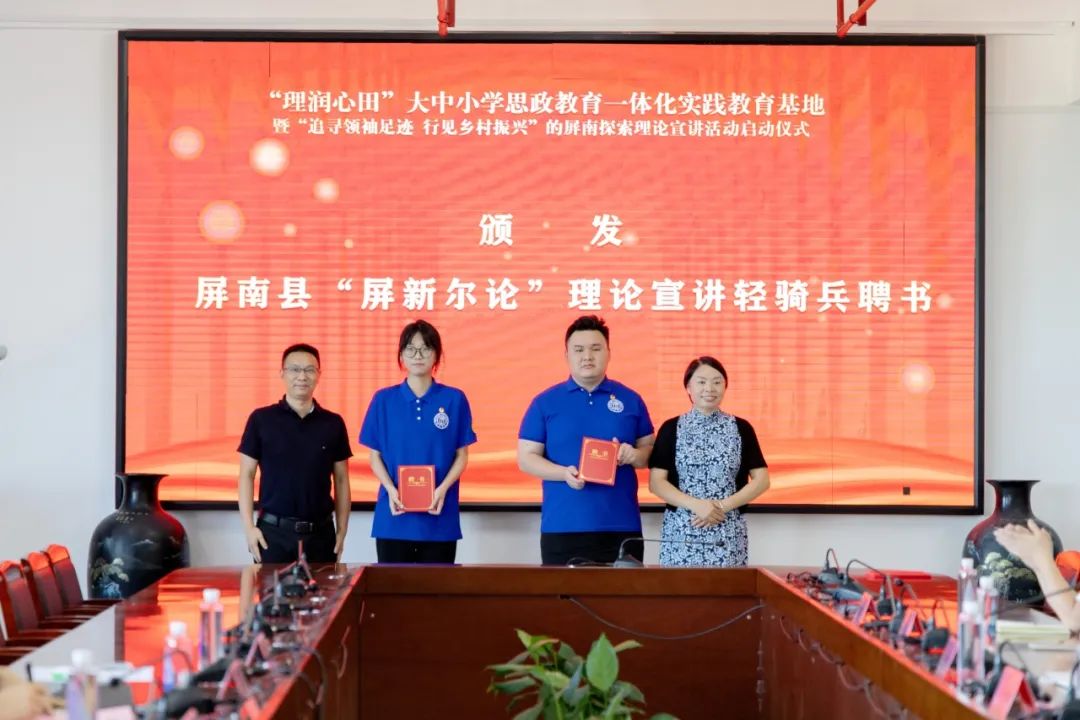 活动中,与会领导为屏南县“屏新尔论”理论宣讲轻骑兵颁发聘书,为屏南县“屏小团”宣讲队、“仙山姐妹”宣讲队乡村振兴宣讲小分队颁发证书。