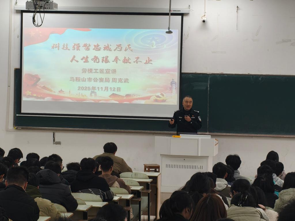 此次报告会邀请马鞍山市公安局情报指挥中心政委周克武走进“中国近现代史纲要”课堂,以“科技强警忠诚为民,人生有限奉献不止”为主题展开教学。