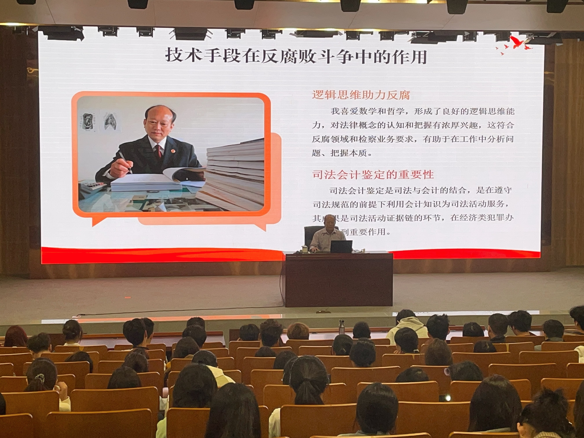 围绕反腐核心主题,金建文通过集资诈骗、金融系统贪污等典型案例,详解了司法会计鉴定等技术手段在案件侦破中的关键作用,强调“无技术则无侦查”的实战经验。他警示师生,“伸手只有零次和无数次之分”,公职人员必须坚守法律底线,严控欲望防线。同时,他结合自身遭遇的诱惑与挑战,讲述了坚守公平正义的职业坚守,传递了“求真知、做实事、讲奉献”的人生追求。