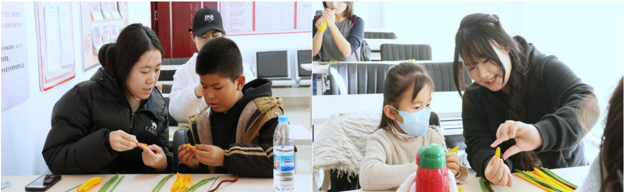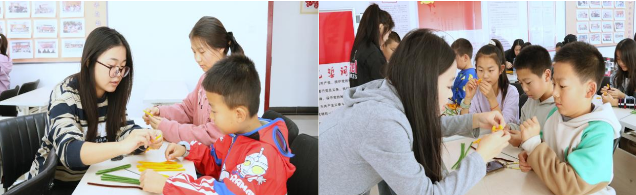 活动中,大学生志愿者化身耐心细致的“手工导师”,围在孩子们身边手把手传授手工制作技巧,指导孩子们通过弯曲、缠绕、拼接等方式制作精美的手作。大家主动观察少年儿童需求,灵活调整指导方式,对动手能力较弱的孩子耐心引导,反复示范。活动现场,志愿者的鼓励、孩子们的提问、清脆的笑声、雀跃的欢呼声交织成趣,让活动现场充满暖意与活力。