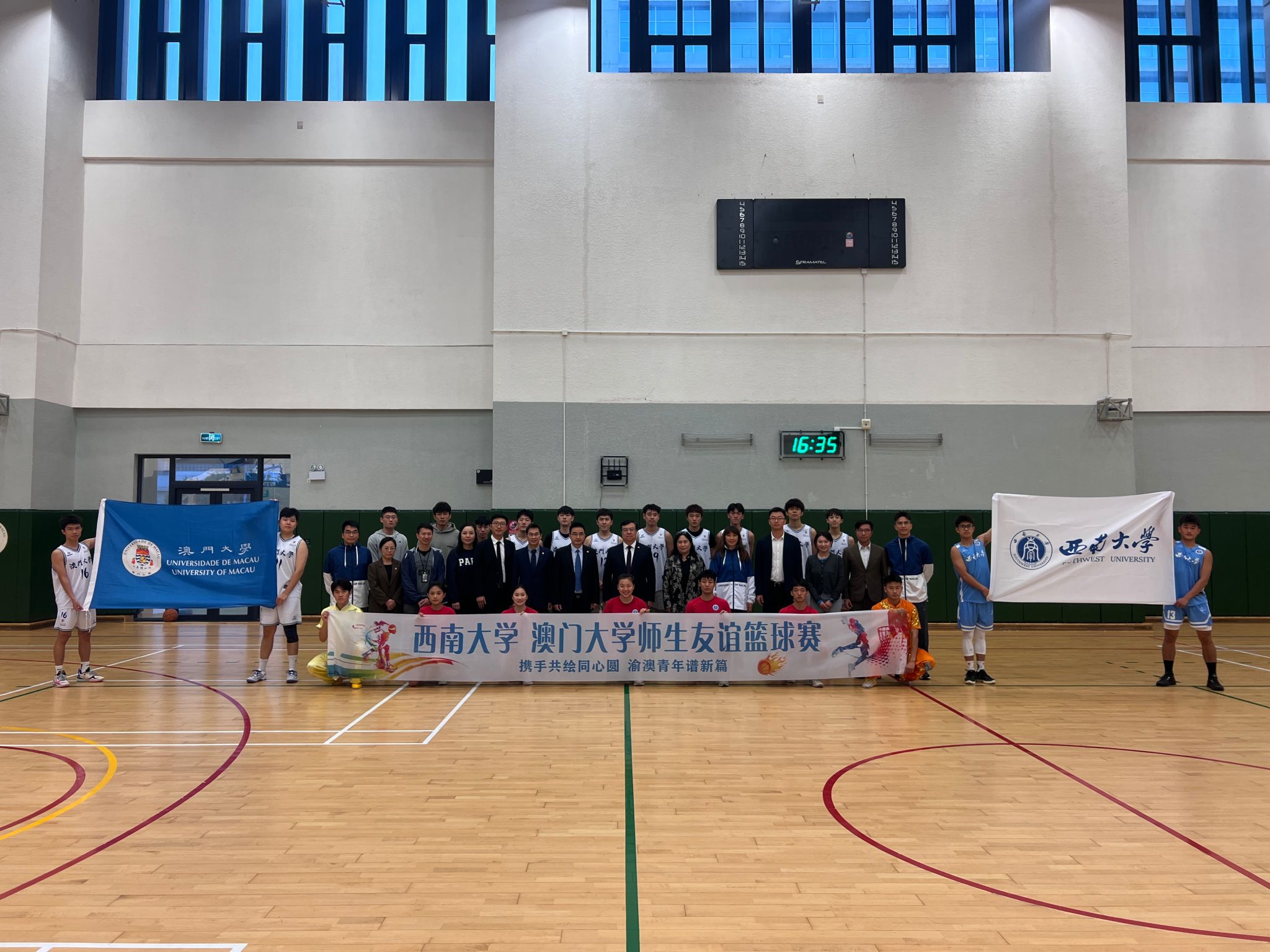 在澳门大学,代表团观看了为献礼澳门回归25周年举行的“西南大学-澳门大学师生友谊篮球赛”和文体演出。来自西南大学的武术代表队、花样跳绳代表队贡献了一场惊艳的文体表演,展示了学校学生蓬勃的青春风采。代表团成员还亲身参与友谊篮球赛,与学生并肩作战,在竞技比拼中增进友谊。