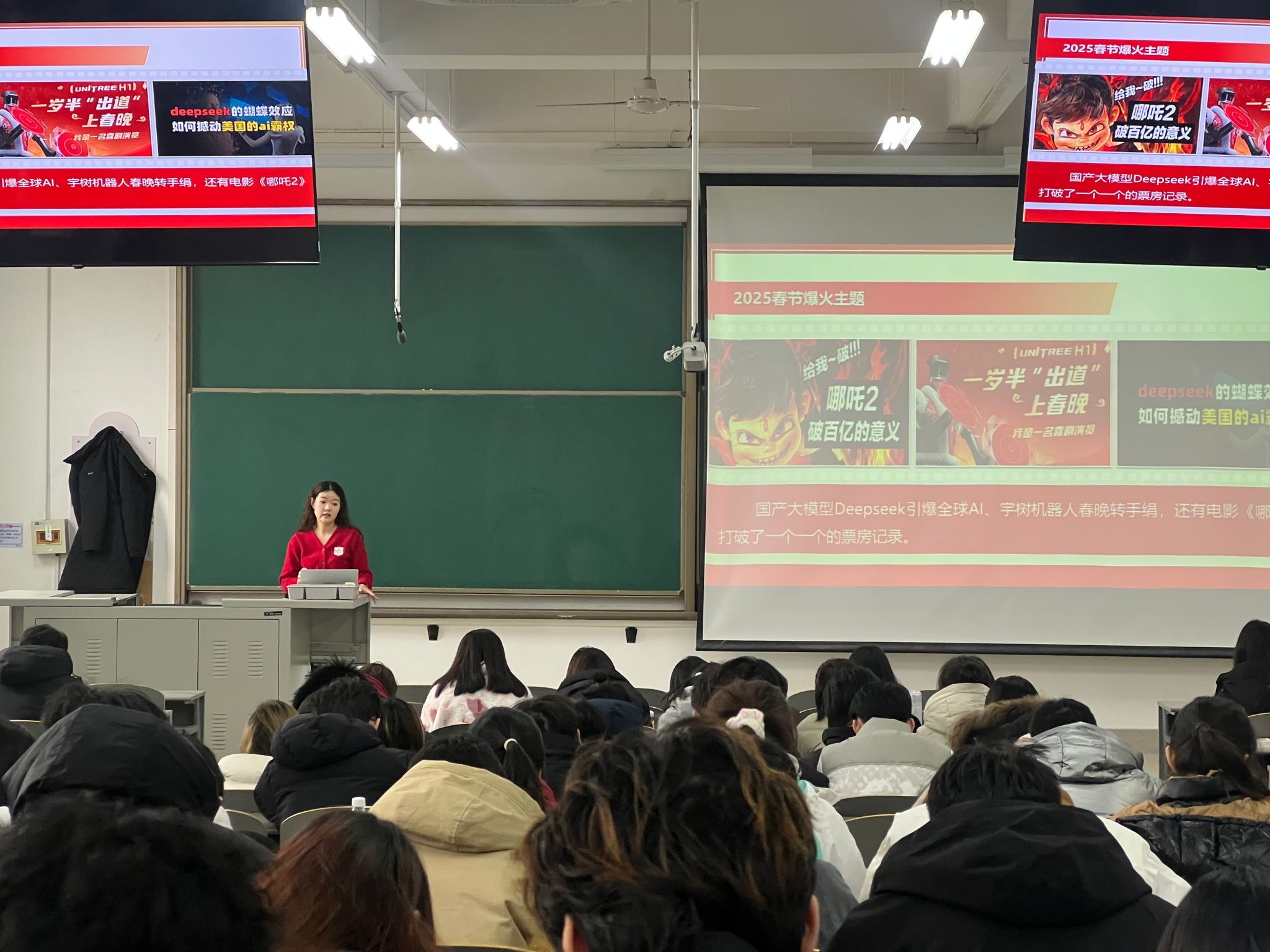 在“思想道德与法治”课堂上,刘桐源老师让所有学生在卡片上写上自己在寒假期间最关注的一件事,“Deepseek”“哪吒”“机器人”等成为大家关注的高频词。“为什么中国AI能在算法‘卡脖子'中突出重围?”“赛博朋克龙宫凭什么让好莱坞坐立不安?”刘桐源老师通过展示DeepSeek研发团队“凌晨四点的算法日志”、《哪吒2》特效组攻克“海水粒子渲染”的技术路线图,引导学生发现:从AI突围到国漫崛起,背后是新型举国体制下“硬科技+软实力”的双轮驱动。