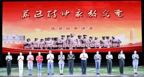 在聂耳剧场,《苏区精神永放光芒》红色情景故事讲演精彩上演。此次讲演由瑞金中央革命根据地历史博物馆组织策划,以“弘扬苏区精神、赓续红色基因”为主题,重点演绎了“红井情深”“一生守望”“十七棵松”等中央苏区时期的经典红色故事。演出充分运用深情讲演、情景再现、舞台特效、配乐渲染等多种艺术表现形式,并融入我校音乐学院师生创排的情景舞蹈《等着你》,沉浸式再现了中央苏区时期的峥嵘岁月。