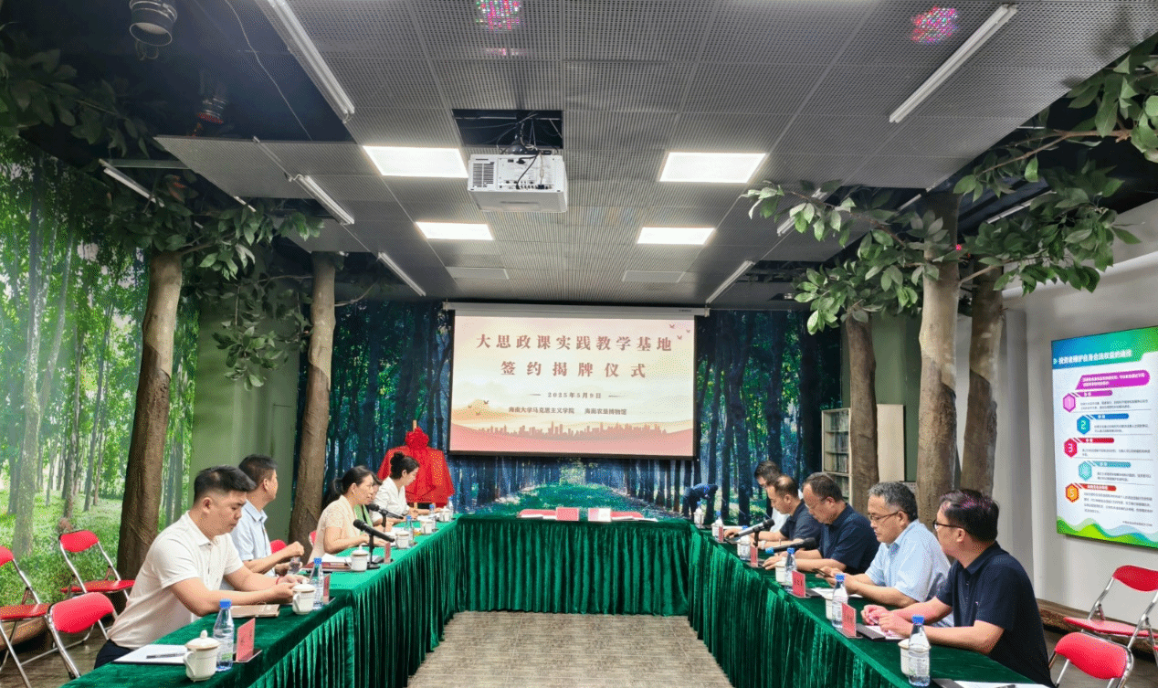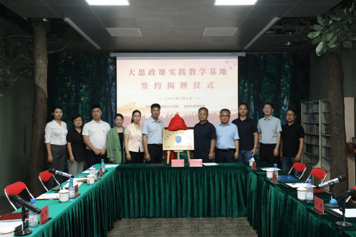 2025年5月9日下午,海南大学马克思主义学院与海南农垦博物馆“大思政课”实践教学基地结对共建签约暨访企拓岗促就业交流活动在海南农垦博物馆举行。海南农垦博物馆副馆长王智,海南大学马克思主义学院副院长王善、蔡文举、王一闳、海南省大中小学思政课一体化建设(海南大学)联盟负责人贺尧夫、学院实习实训负责人龙借琼参与此次揭牌仪式,海南农垦博物馆展陈宣教部部长吴运霞主持活动仪式。