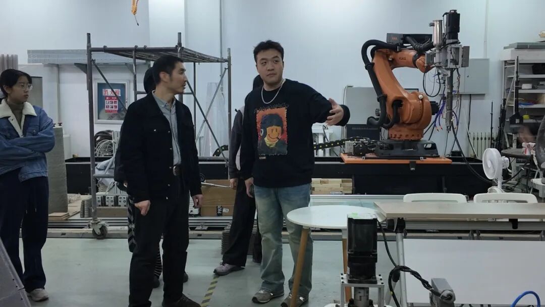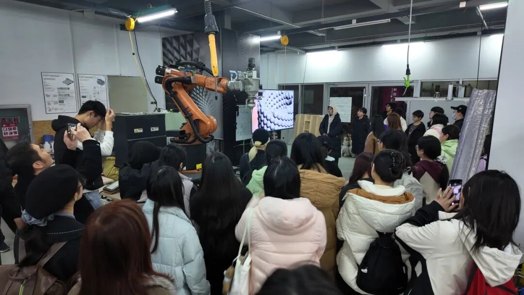随后,师生一行来到滨海人居环境学术创新中心数字构建实验室。机械臂精准高效的作业场景,令同学们直观感受到机器人建造技术为行业带来的革命性变化。石新羽老师指出,数字构建不仅拓展了建筑形态的可能性,更深刻影响着设计思维与行业未来,为同学们理解“智能建造”提供了生动注脚。