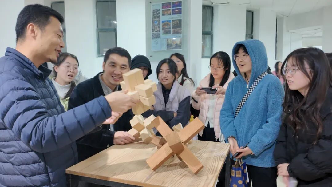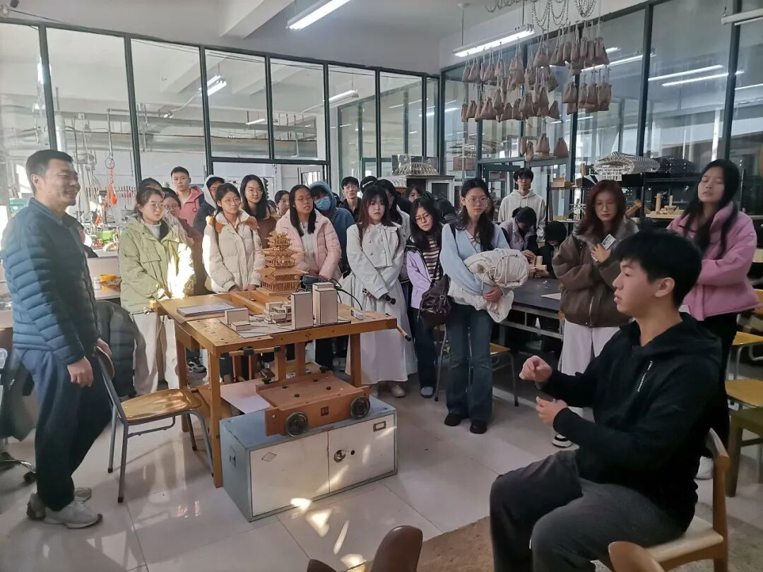 活动伊始,师生们首先走进综合营造实验室。实验室助理为大家系统介绍了建筑模型与木制构件的制作流程,涵盖传统工艺与现代技术手段。同学们近距离观摩各类专业设备与精细模型,体会建筑从概念设计到实体建造所蕴含的严谨逻辑与匠心动人,对“营造”一词有了更为具象而深刻的理解。