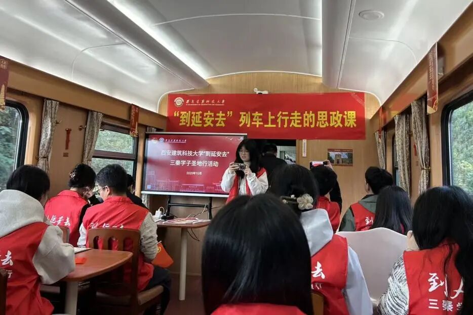 在前往延安的红色专列上,马克思主义学院教师吕夏汀为学生讲授“行走的思政课”。他以“到延安去”为主题,带领同学们回溯党中央在延安十三年的奋斗历程,强调延安对中国革命进程产生的巨大和深远的影响。他讲道,正是因为延安精神的强大号召力,成千上万革命青年才产生了“爬也要爬到延安去”的坚定信念,青年学子在今天到延安学习,就是要继承这宝贵的精神财富。