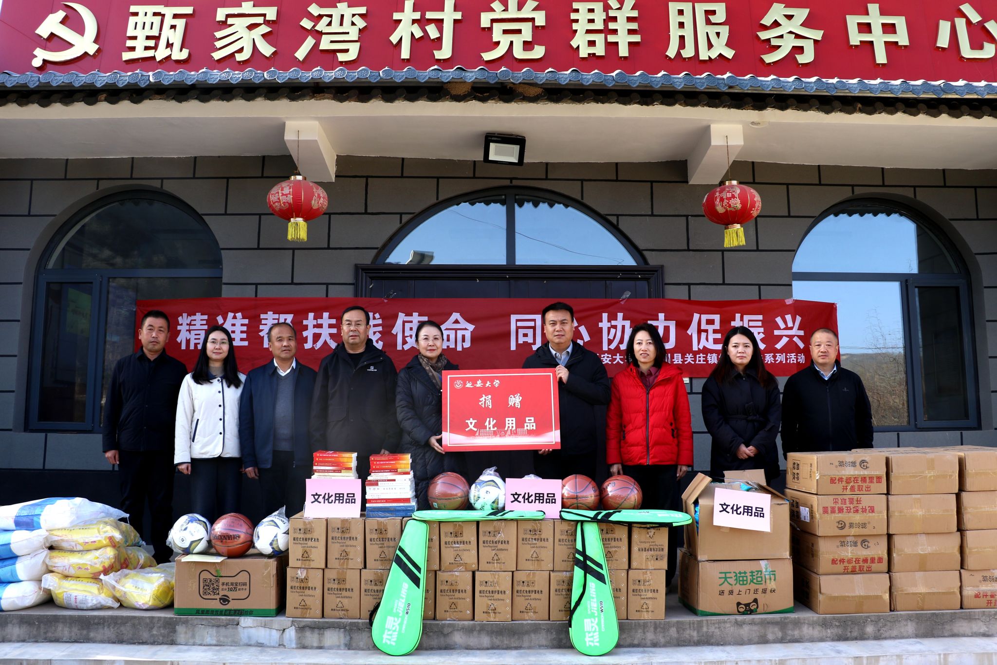 体育学院、外国语学院、建筑工程学院、数学与计算机科学学院党委负责人代表学校,向甄家湾村及二八甲村捐赠了文化用品与生活物资。
