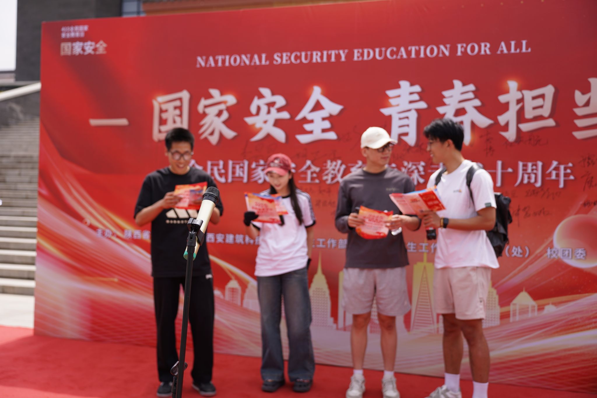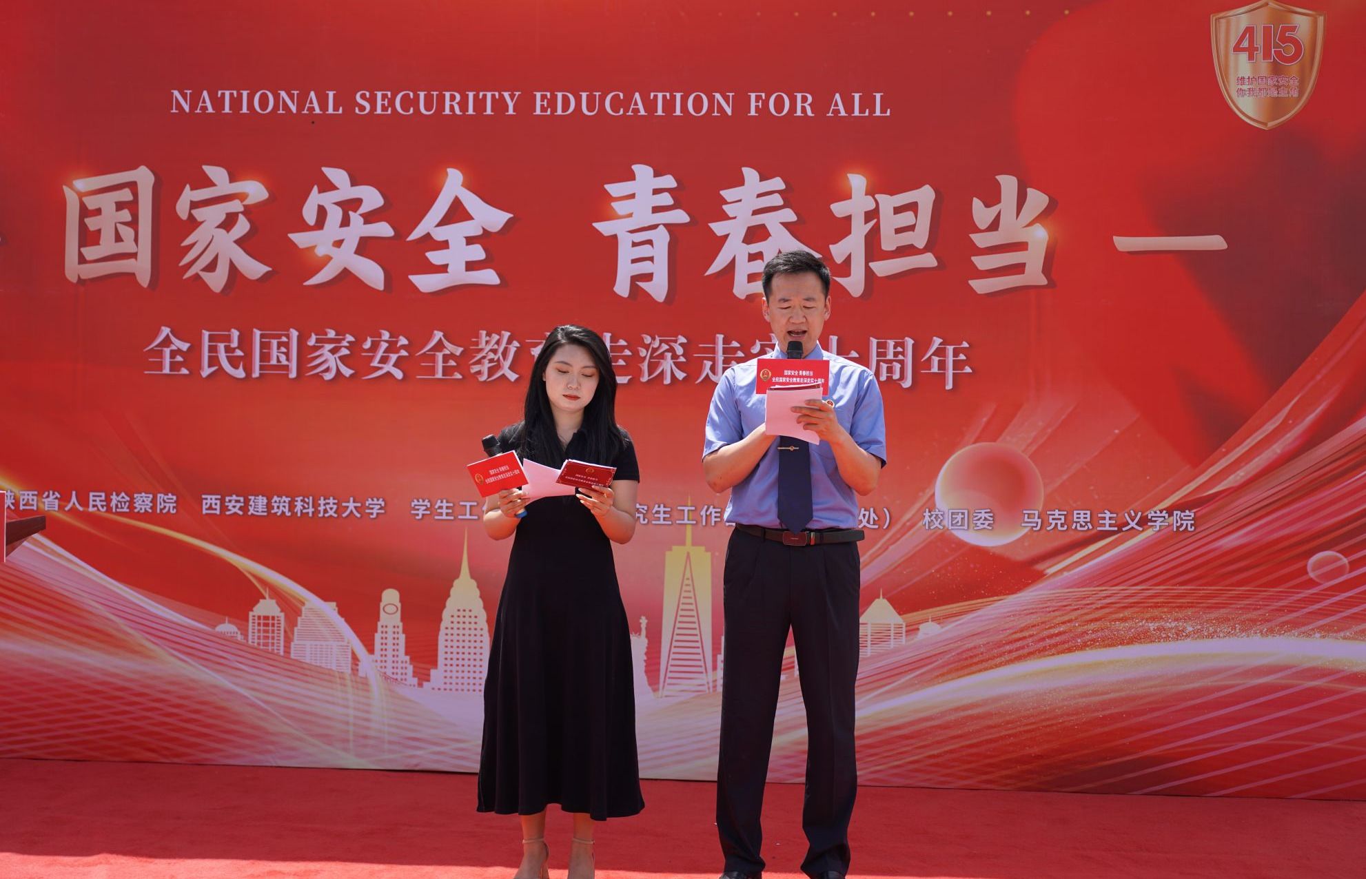 为推动国家安全教育工作深入开展,增强全校师生国家安全意识和法治意识,4月15日,由陕西省人民检察院、西安建筑科技大学、学生工作部(处)、研究生工作部、保卫部(处)、校团委、马克思主义学院主办的“国家安全,青春担当——全民国家安全教育走深走实十周年”活动在我校草堂校区紫阁大礼堂前举行。陕西省人民检察院重大犯罪监察部副书记段立峰、普通犯罪监察部副书记杨建东,马克思主义学院院长宋阳、团委书记姚丹出席此次活动。