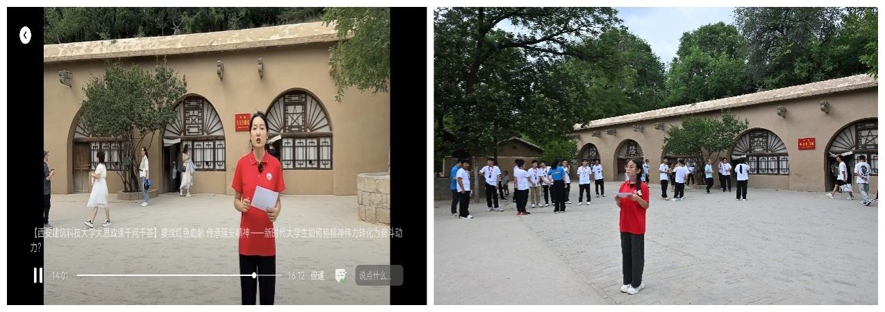 讲好一堂思政课,不仅考验的是授课人的理论功底,更是一种对马院人“自信力”的考察。经过这段时间的社会实践,实践团师生们对革命精神内涵有了新的领悟,对革命精神的时代价值有了更深的认识,让收获及时共享给更多人是实践团工作的重要目的。在枣园革命旧址毛泽东旧居前,实践团师生架起了直播设备,利用“西建大千问千答”微信视频号面向学校师生进行了题为“赓续红色血脉 传承延安精神——新时代大学生如何将精神伟力转化为奋斗动力”的“大思政课”线上讲授。本次直播讲授,共收到3000余次“点赞”、4000余次“喝彩”,32条有价值的评论,得到了校内师生和景区游客的一致好评,为学校“千问千答大思政课”丰富形式和拓展载体的实践积累了新的经验。