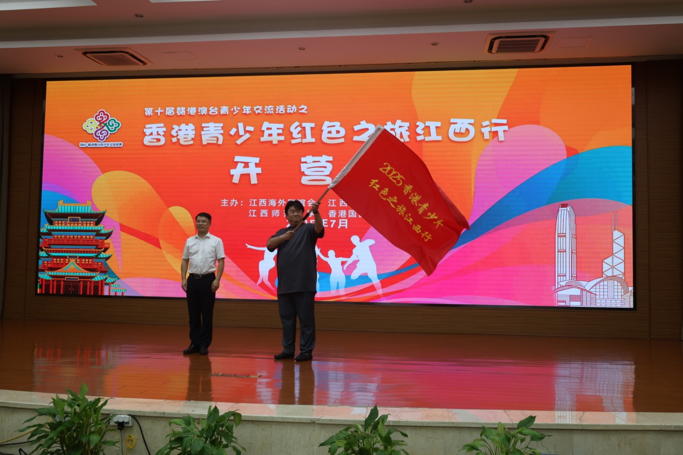 开营式上,易军向香港青少年红色之旅江西行参访团授旗。