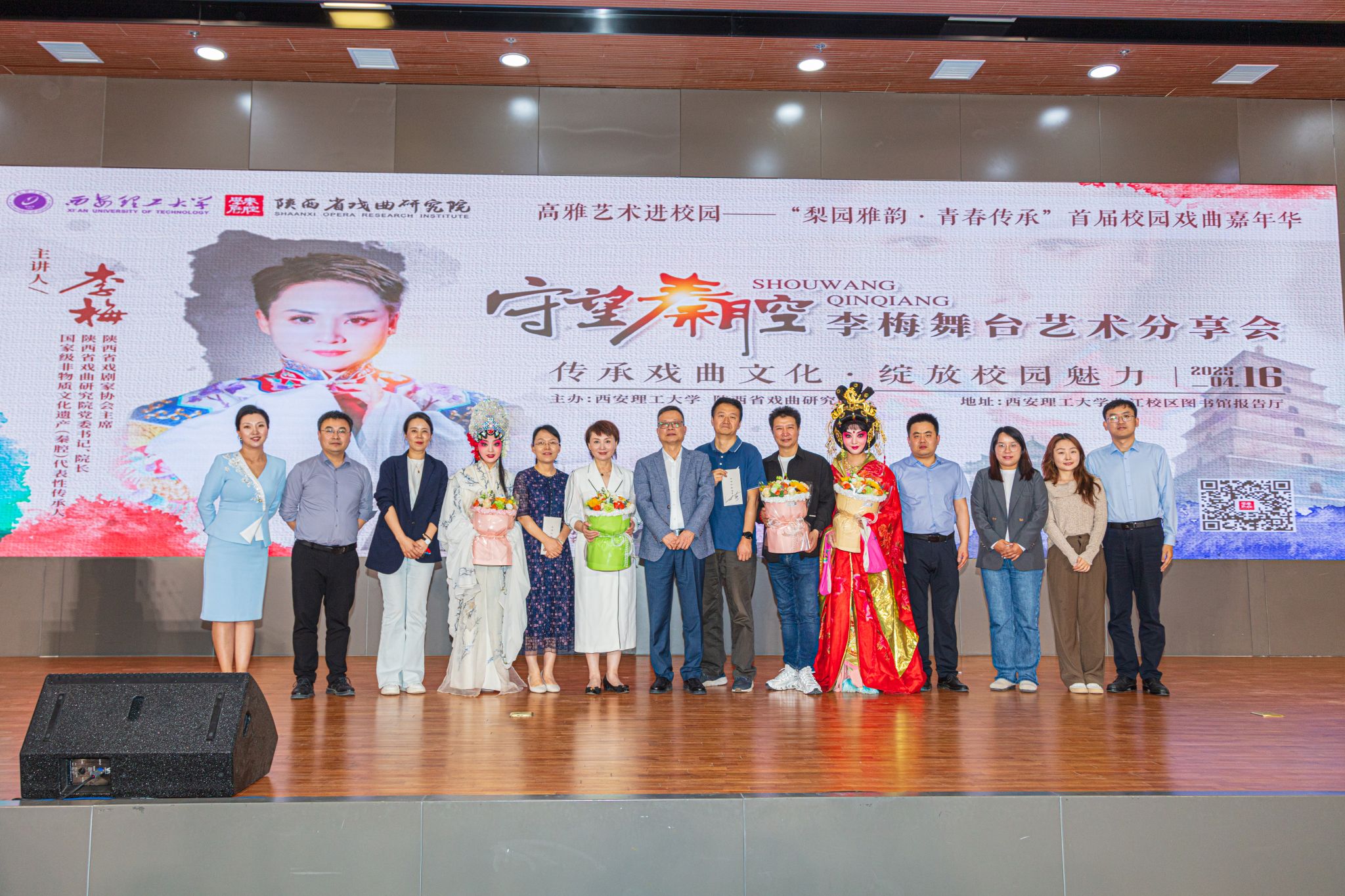 活动特邀陕西省戏曲研究院院长、中国戏剧“梅花奖”得主李梅开展《守望秦腔》艺术讲座,系统阐释秦腔艺术发展脉络,现场演绎经典剧目片段,并为我校大学生美育实践基地和戏曲文化传承教育基地揭牌。活动现场还设置了戏曲服饰、妆造、皮影、剪纸、数字化非遗、古法拓印等八大主题展区,由专业团队指导师生体验秦腔戏妆绘制、皮影剧目操作及剪纸技艺,结合现代科技呈现非遗创新成果。