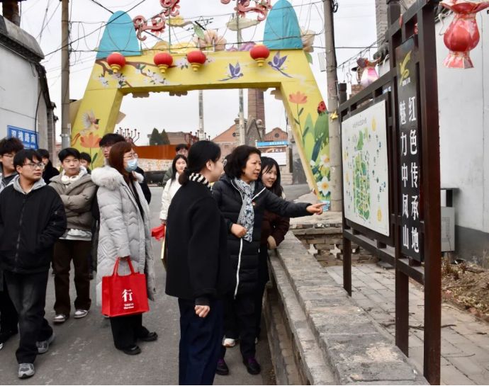 随后,师生一行来到正丰左岸凤山艺术村。这里毗邻国家级重点文物保护单位正丰矿工业遗址,以“艺术赋能乡村振兴”理念激活工业遗产,将百年煤矿“支援西柏坡电力建设”的红色记忆,与古村落肌理深度融合。井陉矿区凤山镇副镇长高扬向大家介绍到:“老厂房变身文创工坊,旧街巷点缀艺术画作,‘工业锈带’向‘艺术秀带’的蝶变,不仅让百年矿史有了新载体,更带动了村民增收,让红色基因在发展中得以传承。”