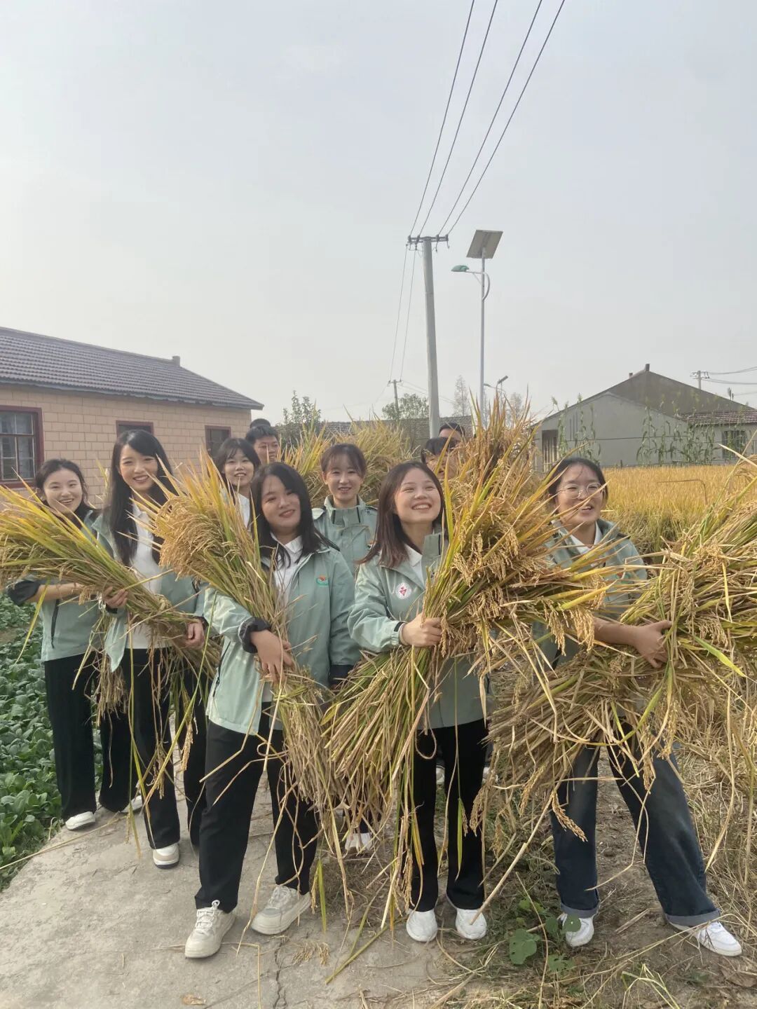 当天下午,我院师生与朱墩村村民共同走进田间地头,参与水稻收割、脱粒等农事体验。通过亲身实践,学生们在劳动中感受农耕文化的厚重底蕴,在泥土与汗水间深化对“田野思政”的理解,将思想政治教育融入真实的乡村场景中,实现课堂知识与社会实践的有机融合,为“接地气”的思政育人开辟了新路径。这种双向互动的农耕体验,不仅丰富了学生的劳动教育内容,也为乡村文化注入了青春活力,增强了学子服务基层的责任感与使命感。