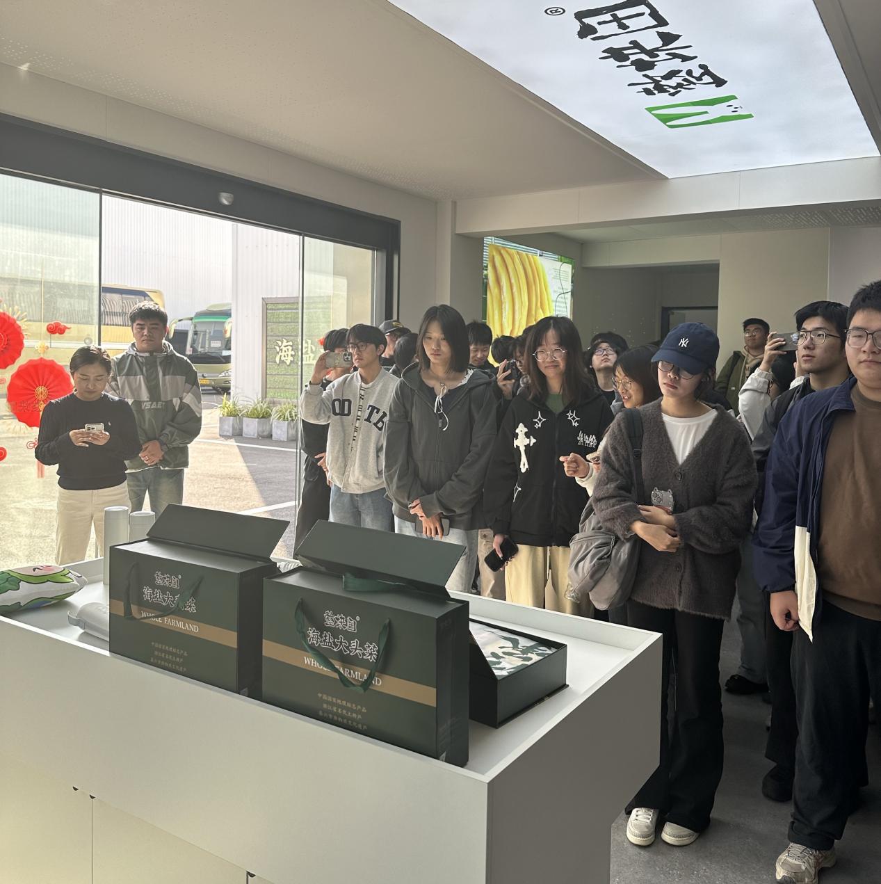 师生队伍首站前往雪水港村。活动伊始,师生们抵达浙江整块田食品有限公司。在企业负责人的带领下,学生们沿着大头菜从原料筛选、清洗腌制到分装出厂的全流程实地探访,近距离观摩传统腌制工艺的传承与创新,直观感受传统食品产业在现代市场环境下的转型路径,深刻体会特色产业如何成为激活乡村经济的“造血干细胞”。