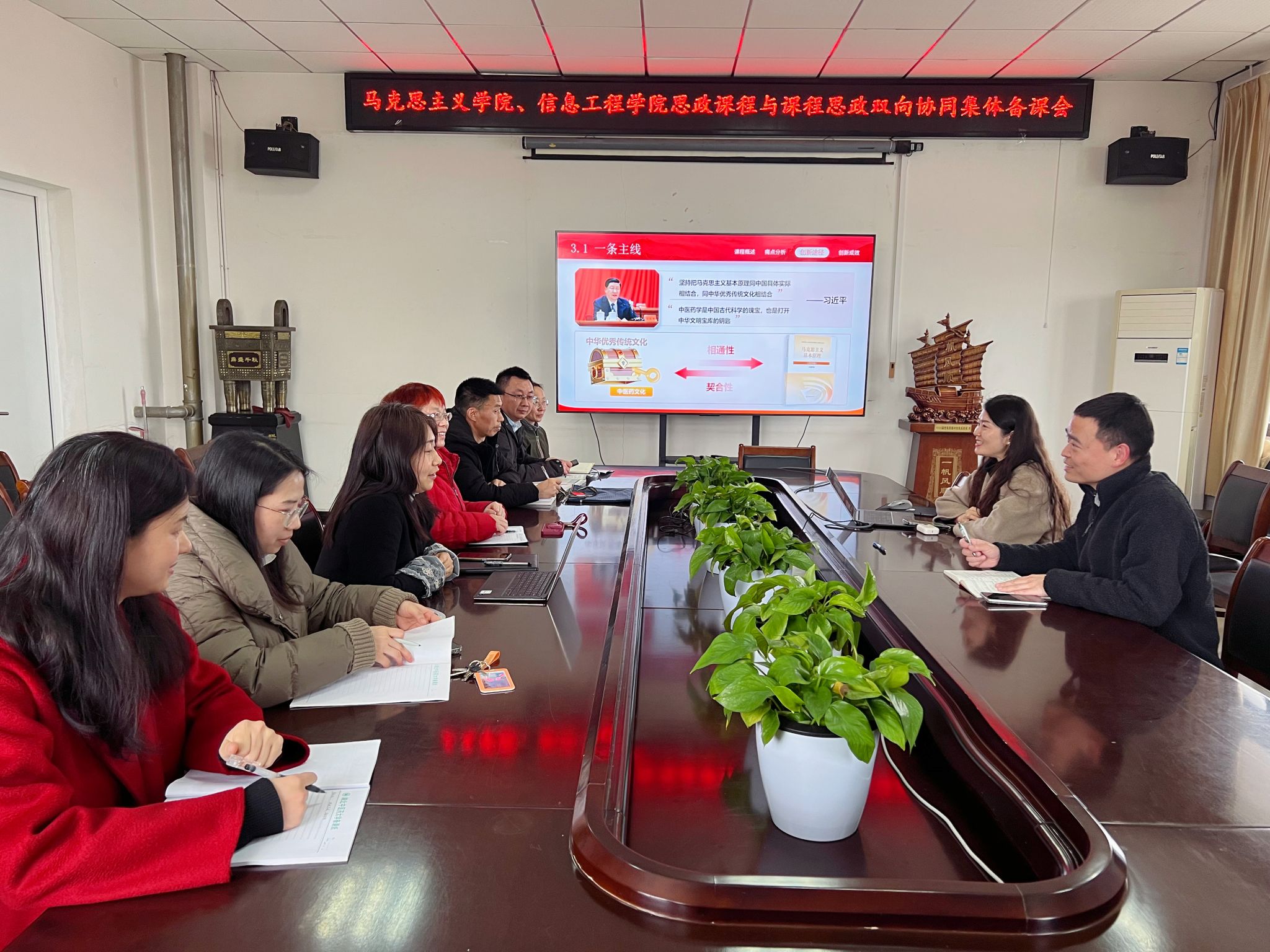 2月27日至3月28日,马克思主义学院全体思政课教师与我校12个学院结对开展为期一个月形式多样的跨学院、跨学科、跨课程的思政课程与课程思政双向协同集体备课会。此次集体备课会以强化思政引领力,推进思政课程与课程思政双向协同,构建中医药特色大思政育人格局为目标,共同探讨中医药特色思政课和专业课的共融共建的途径,推进马克思主义基本原理与中华优秀传统文化相结合,推进时珍文化进课堂,实现价值塑造、知识传授、能力培养的有机统一。