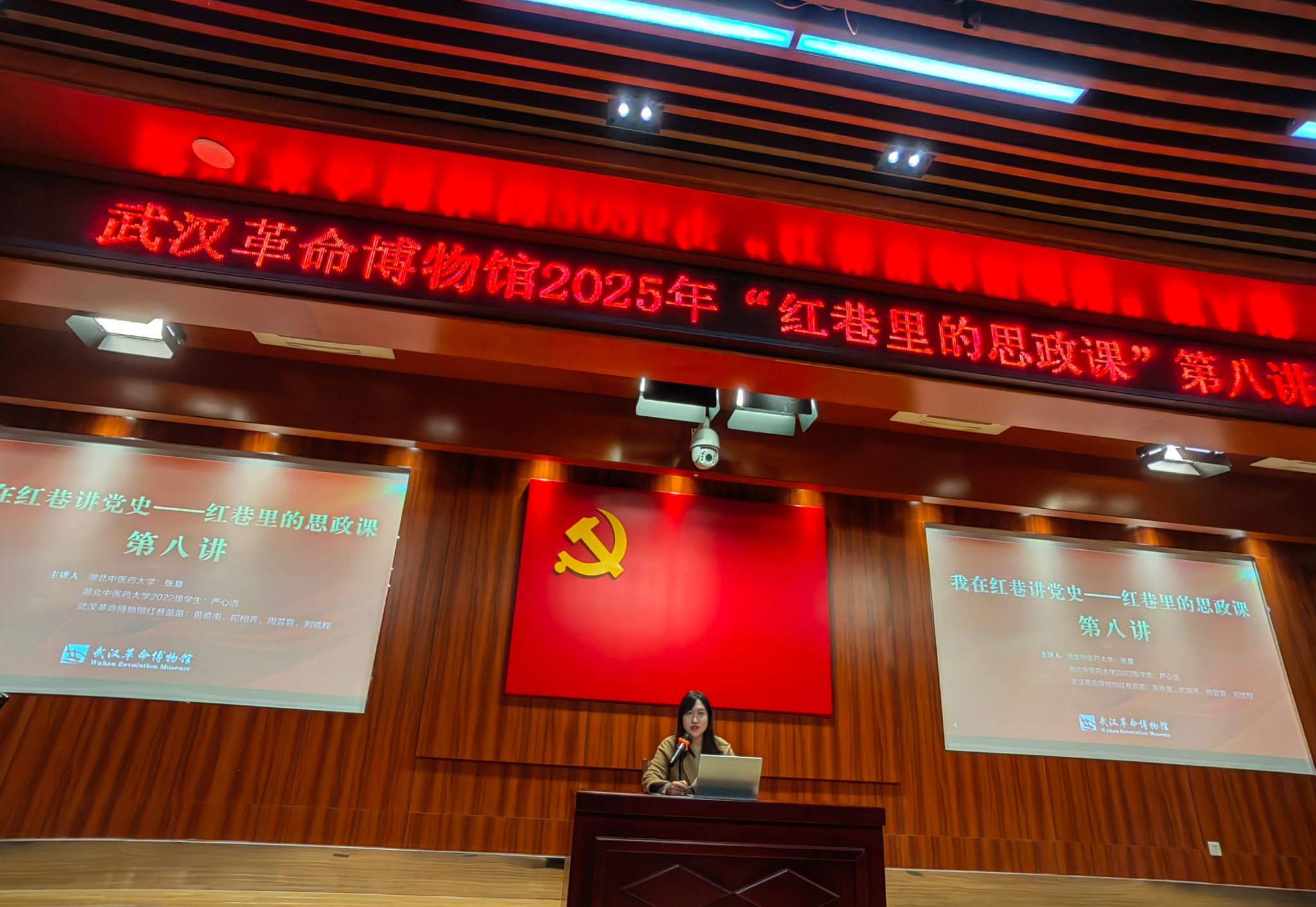 由武昌区联合武汉革命博物馆、湖北中医药大学、武汉大学、华中科技大学等9所高校马克思主义学院共建的“大思政课”实践教学优质平台——“红巷里的思政课”第八讲在武汉革命博物馆开讲。学校马克思主义学院副教授张夏和青马工程学员严心语同学,以“教师理论授课+学生宣讲传承”的形式,带来一堂兼具理论深度与实践温度的精彩思政课。