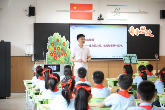 课堂上,张施洋还以弹奏吉他、带领同学们演奏乐器的形式,让小学生们感受到生命的律动。学生们通过这次体验,深入理解了生命的美好与坚韧,进一步激发了他们珍爱生命、爱国奉献的情感。五年级三班的学生王珺涵表示:“生命有时快乐,有时悲伤,但我们必须珍惜生命,每个人的生命都是鲜活的。”