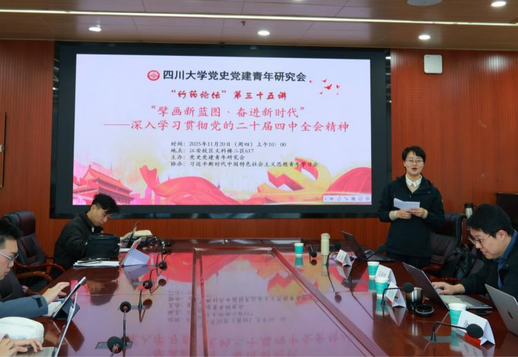 为深入理解党的会议精神,2025年11月20日上午10时,我院学生社团党史党建青年研究会于江安校区文科楼二区617会议室举办第三十五期“竹筠论坛”。特邀请学院教授付志刚老师、助理研究员徐宇老师担任本期论坛主讲嘉宾,我院部分硕博研究生、本科生参与本次论坛。此次论坛由学院助理研究员赵大琳老师主持。