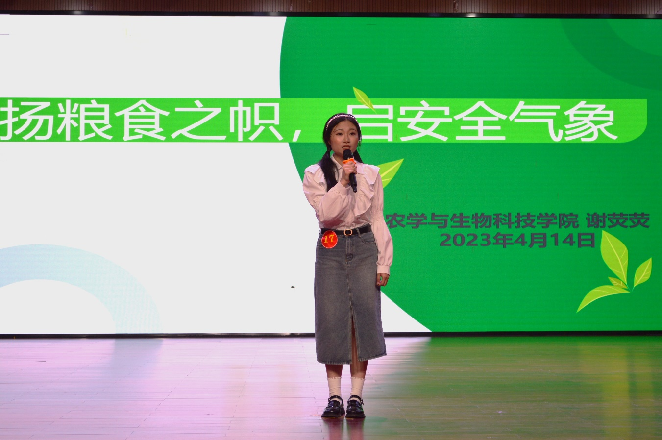 来自农学与生物科技学院的谢荧荧表达了对袁隆平院士的深切怀念,同时结合自身专业特点,从粮食安全角度出发,讲述粮食安全对国家发展安定的重要性,呼吁广大青年学子为维护国家粮食安全贡献青春力量。比赛中选手们各展风采,结合自身所学专业以及国家安全的16个方面,生动诠释着国家安全的重要性以及身为青年学子担负的责任。