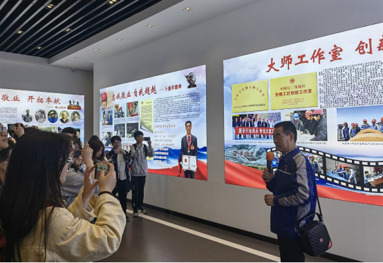 在工匠基地,卜维平带领大家参观了采用3D打印新技术建成的工作室和展示馆,向大家简要介绍了南山矿的发展以及劳模工作室的建立等情况,并对工作室的团队建设和主要成果等作了详细讲解。在现场授课中,卜维平分享了自己从普通电铲车司机到高级技师、全国技能大师的成长经历,阐释了勤学苦练、持之以恒、不断创新的重要性。现场师生被矿山工人严谨专注的劳动热情和精益求精的劳动态度所折服。