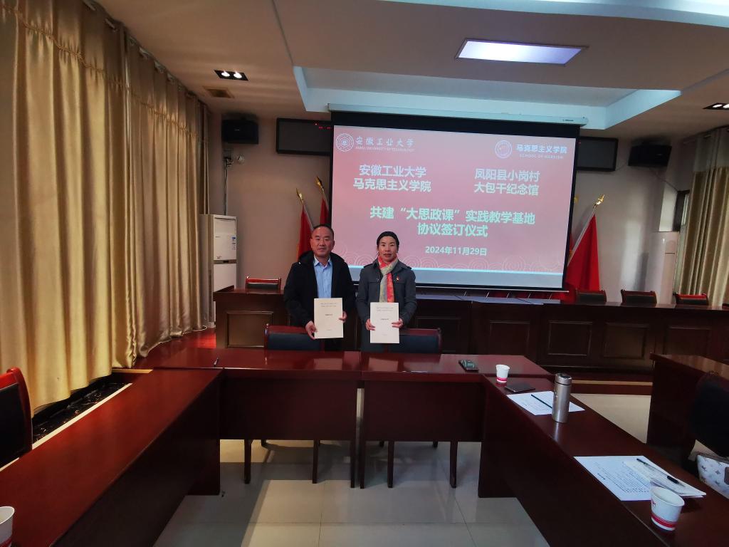 为深入贯彻落实党的二十届三中全会精神、习近平总书记关于“大思政课”建设的重要指示精神和教育部“大思政课”结对共建活动的指示要求,11月29日,安徽工业大学马克思主义学院与凤阳县小岗村大包干纪念馆,在小岗村召开构建“大思政课”实践育人新模式教学交流会,并就共建“大思政课”实践教学基地举行签约仪式。小岗村党委委员吕计跃,村党委委员、办公室主任贾贵,村旅投公司董事长杨永强等参加,安徽工业大学马克思主义学院院长郑洁、院工会主席毕圣海,“概论”教研室主任阮超群、党支部书记周玉英等参加。会议由党的二十大代表、小岗村党委书记、村委会主任周群之主持。