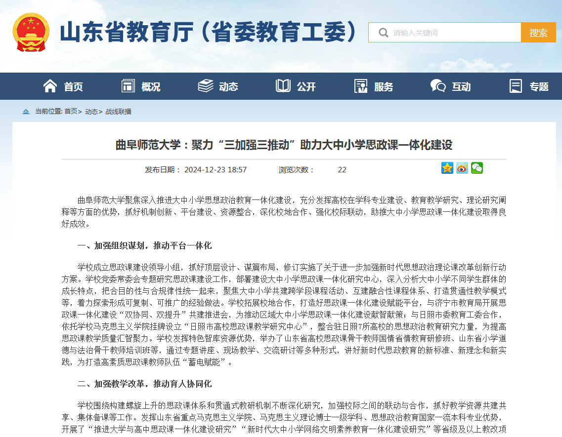 曲阜师范大学聚焦深入推进大中小学思想政治教育一体化建设,充分发挥高校在学科专业建设、教育教学研究、理论研究阐释等方面的优势,抓好机制创新、平台建设、资源整合,深化校地合作、强化校际联动,助推大中小学思政课一体化建设取得良好成效。