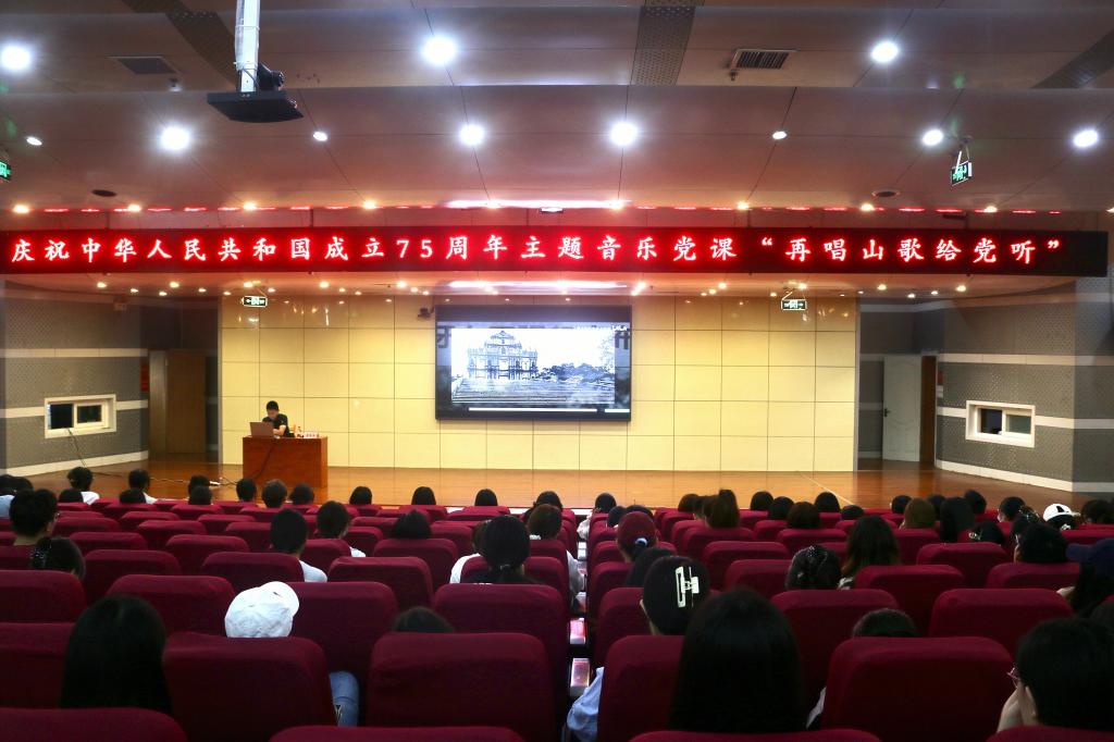 马克思主义学院讯 9月27日,为庆祝中华人民共和国成立75周年,弘扬伟大建党精神,马克思主义学院党委副书记姜振栋,为马克思主义学院、管理学院、翻译学院学生讲授了题为“再唱山歌给党听”的音乐党课,以音乐谱写初心使命,用歌声传承红色基因。