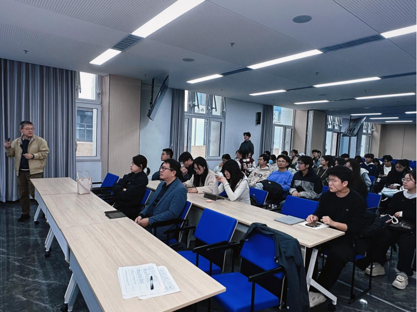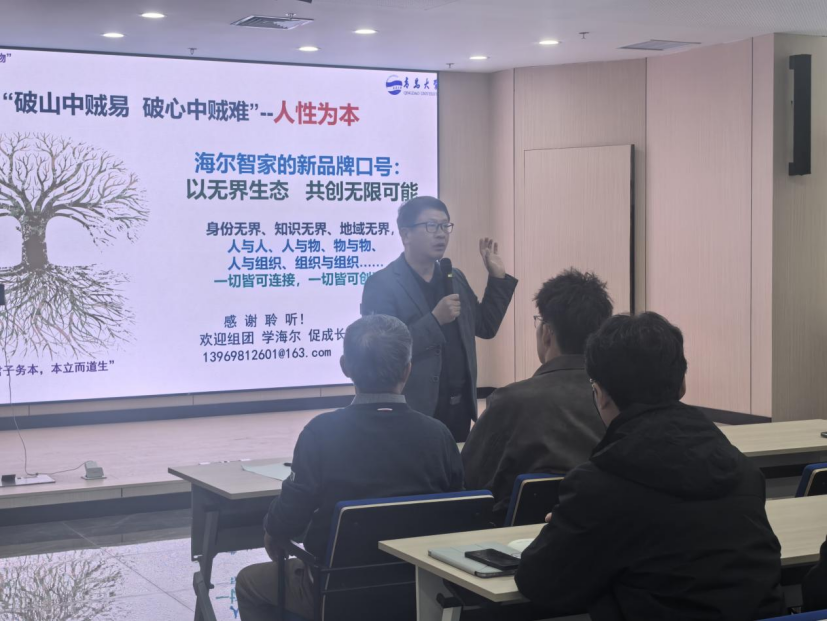 2025年10月25日上午,青大思政大课堂第五期“企业家暨海尔‘人单合一’管理模式研习班”第一次线下课程在青岛大学浮山校区新纺织大楼210多功能厅顺利举行。本次课程特邀青岛大学健康医疗大数据研究中心副主任、副教授管永建老师担任主讲,来自全校十余个学院的研习班学员齐聚一堂,现场座无虚席,学习氛围浓厚。