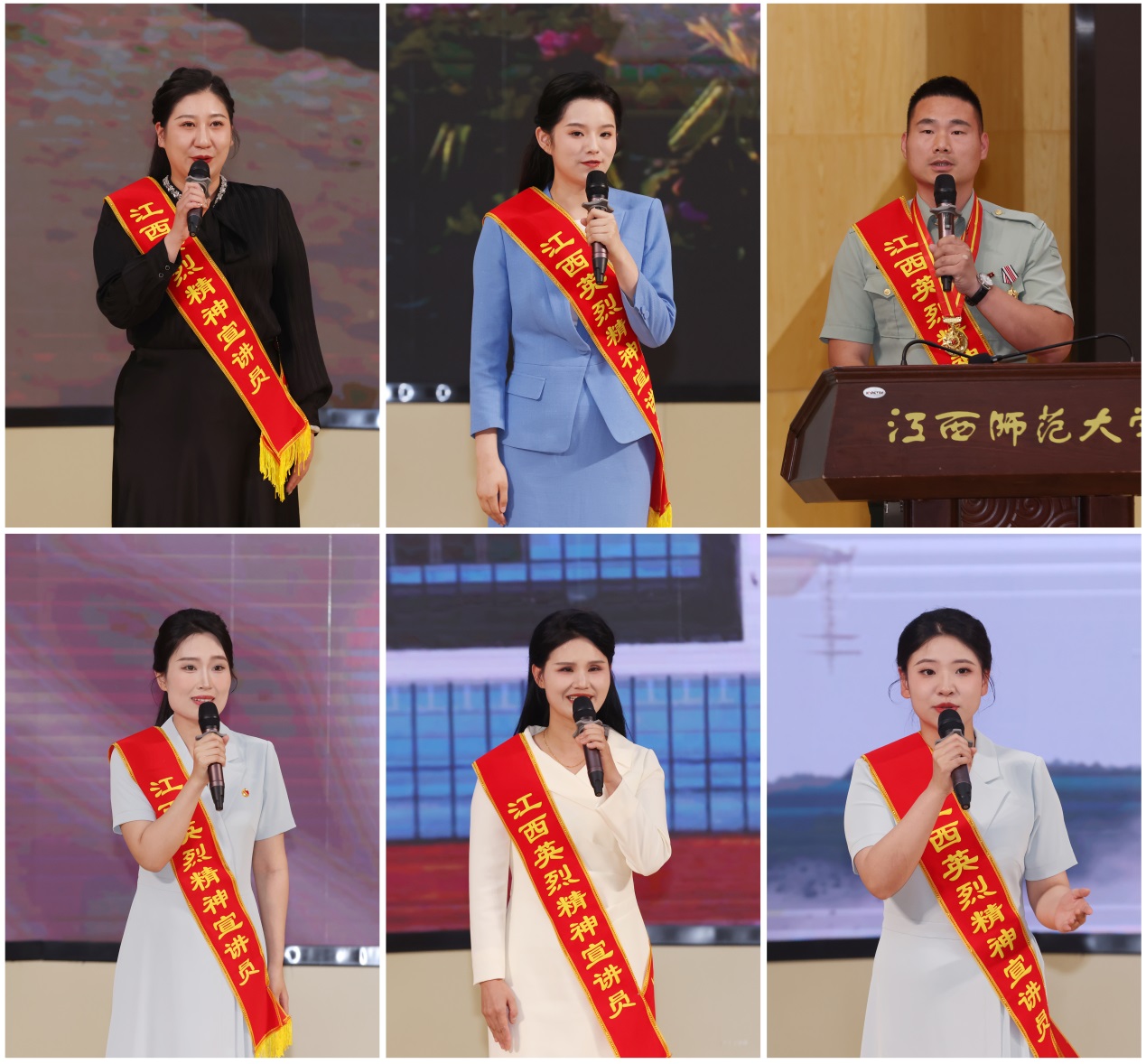 宣讲活动现场,六位宣讲人以饱满情感、生动语言诠释江西英烈精神。南昌市方志敏烈士纪念园讲解员孔悦以《脚镣锁忠骨 初心写千秋》回溯方志敏烈士狱中坚守信仰的事迹;江西省革命烈士纪念堂讲解员郭漂在《待到胜利 鲜血花开》中,讲述许瑞芳烈士投身革命、无畏牺牲的故事;全国模范退役军人、全国老兵宣讲团成员喻立猷结合自身经历,以《传承英烈精神 赓续红色血脉》号召青年传承红色基因,弘扬英烈精神;江西省革命烈士纪念堂讲解员郭李薇的《绽放》聚焦新时代英雄阮建红的英勇事迹;赣州市于都县革命烈士纪念馆宣讲员彭媛以烈士遗孀段桂秀的视角,讲述其87年等待红军丈夫王金长归来,用一生践行守望承诺,诠释于都军民鱼水情深的动人故事;江西省革命烈士纪念堂讲解员罗囿茜的《书生赤胆映山河》,刻画了我校先贤姚名达烈士以身报国的赤子之心。