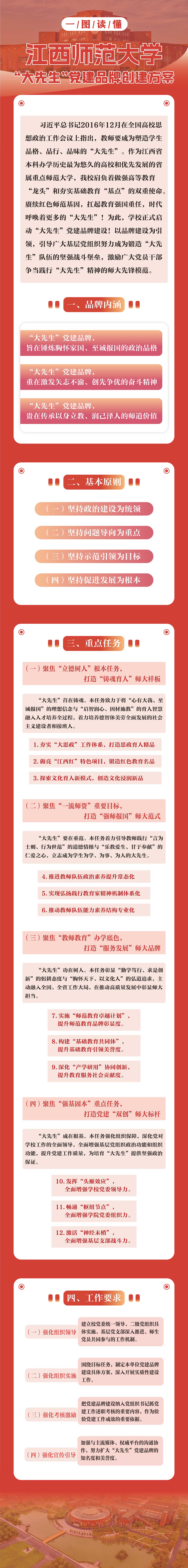日前,学校党委印发《江西师范大学“大先生”党建品牌创建方案》,全面启动“大先生”党建品牌建设工作。