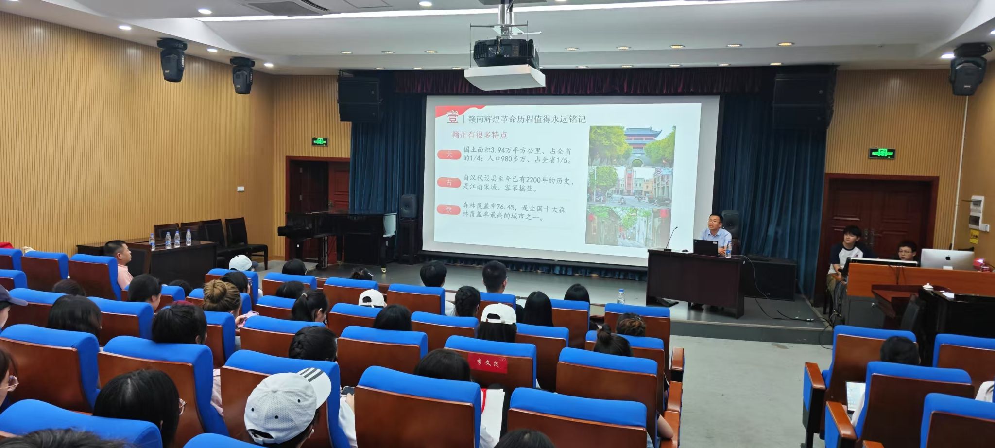 赣州市委办公室网站管理中心副主任孙聪荣以《感悟振兴发展历程增进爱党爱国情怀》为题,从赣南辉煌革命历程值得永远铭记、苏区振兴重大成就令人骄傲自豪、赣州发展新的征程呼唤青年力量四个方面为师生们详细讲解了苏区振兴历程,生动讲述了赣南老区从革命岁月走向振兴发展的奋斗故事,分享苏区振兴给赣南带来的深刻变化,呼吁青年学子在新时代的伟大变革中坚定理想信念、立志挺膺担当,展现青年风采、贡献青年力量。