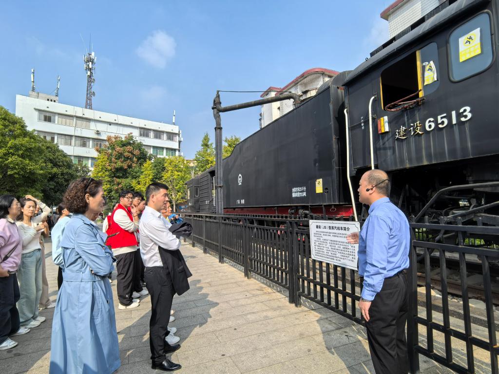 在衡阳铁路博物馆,师生们跟随衡阳铁路博物馆馆长和讲解员的脚步,先后参观了馆外展览部分和博物馆室内展馆。馆外陈列了建设型蒸汽机车和一列S12型守车等铁路文物,见证了我国铁路发展史。铁路文化广场上《团结˙奋进》的雕塑则象征着衡阳铁路建设发展中“政企携手”“路地共建”“辉煌同铸”。內馆陈设丰富,共有4个主要展厅和5个专业展室,详细介绍了衡阳地区铁路一个世纪的发展历程,再现了衡阳铁路跌宕起伏、波澜壮阔的历史画卷,浓缩了几代衡阳铁路人的创业史、奋斗史、发展史。师生们深入学习了铁路建设者们艰苦奋斗、无私奉献的精神。