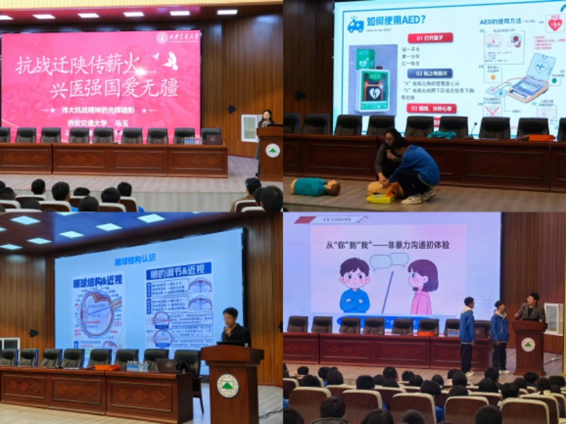 当晚,西安交通大学宗濂厚德书院党建秘书马玉,宗濂厚德书院党总支副书记李欣怡,硕5155班党支部书记高文涛,宗濂厚德书院党总支青工委员李涵宇分别围绕抗战迁陕精神、急救科普、近视防控及心理健康四个话题,为高一年级400余位同学带来精彩宣讲,现场互动活跃,反响热烈。