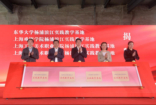 (杨浦区委常委、宣传部部长卢刚,东华大学党委副书记崔运花,上海工艺美术职业学院党委书记许涛,上海电影艺术职业学院党委副书记吕旻,上海戏剧学院马克思主义学院、人文社会科学部党支部书记施华东,为东华大学杨浦滨江实践教学基地、上海戏剧学院杨浦滨江实践教学基地、上海工艺美术职业学院杨浦滨江实践教学基地、上海电影艺术职业学院杨浦滨江实践教学基地成立揭牌)