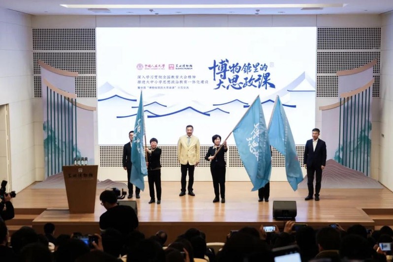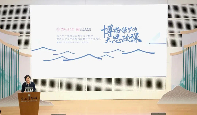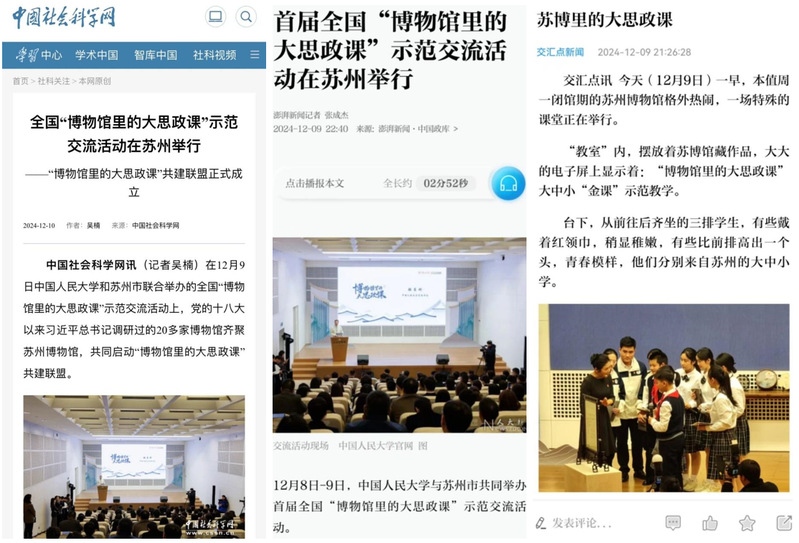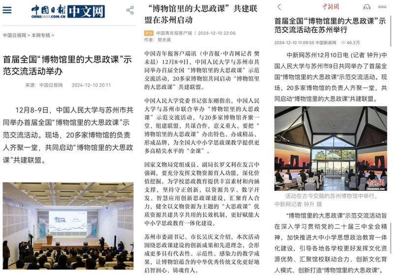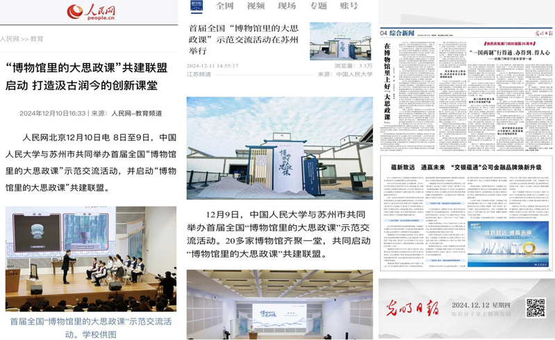 为加快推进大中小学思想政治教育一体化建设,引导各地各学校更好发挥文博资源优势、汇聚馆校联动合力、创新文化育人模式,在教育部、国家文物局、团中央的指导和新华社新闻信息中心、中央广播电视总台研究院、人民教育出版社支持下,中国人民大学联合苏州市于 2024 年 12 月 8 日至 9 日在苏州举办全国“博物馆里的大思政课”示范交流活动。苏州大学马克思主义学院院长孙建华、副院长朱蓉蓉、院长助理孔川,院长助理林慧平等60余名师生代表受邀参加。