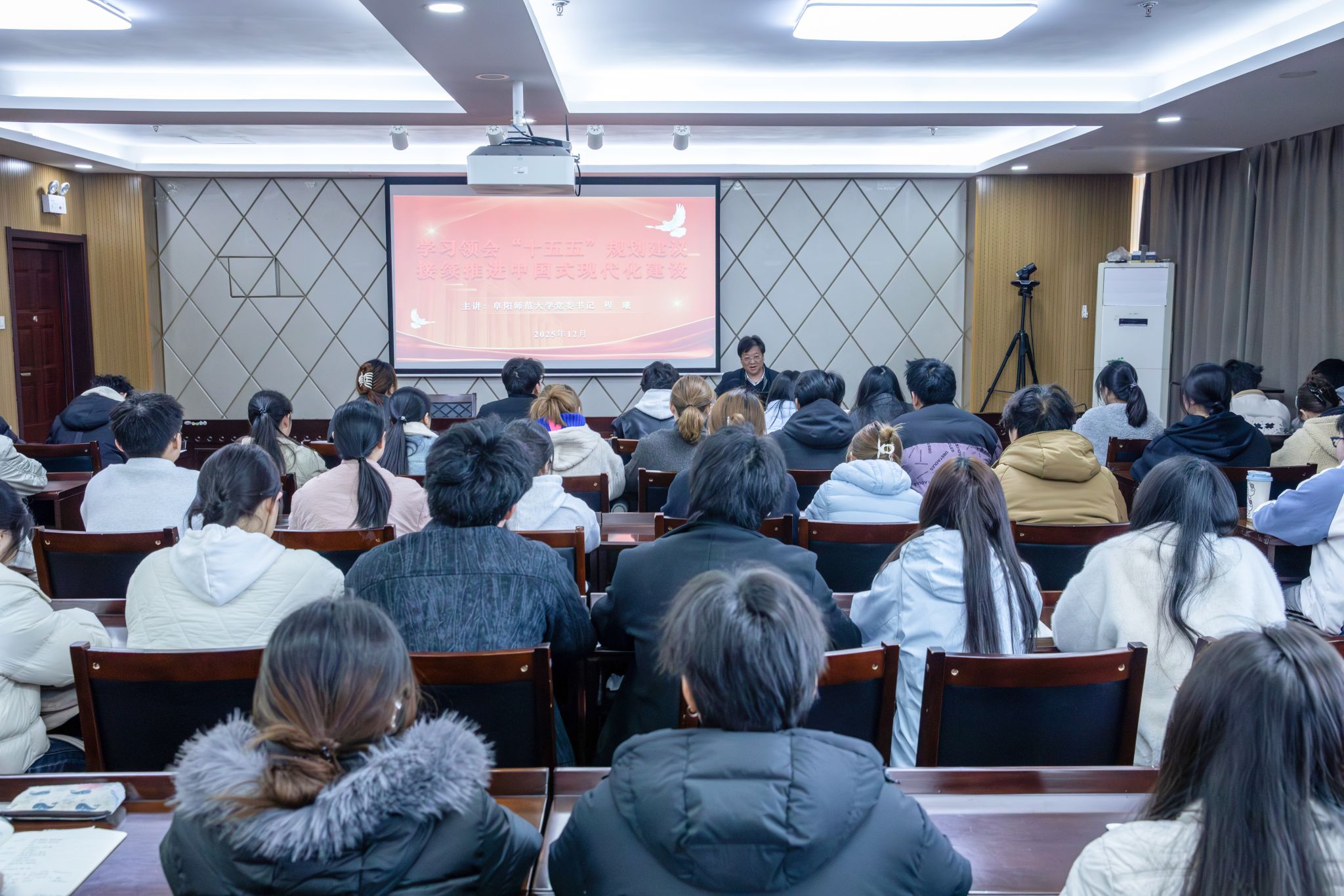 3月12日下午,程曦在西湖校区正行楼1302会议室,以“学习领会‘十五五’规划建议 接续推进中国式现代化建设”为主题,为青年学子带来一堂兼具思想深度与实践温度的思政课。他深刻阐释了党的二十届四中全会召开的重大意义,系统回顾了“十四五”时期我国经济社会发展取得的历史性成就,客观分析了“十五五”时期面临的复杂国内外形势,重点解读了“十五五”时期经济社会发展的战略任务与重大举措。