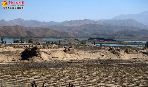从乌拉泊古城历史文化展览馆向古城而行,有专门的观光区间车将参观者带至古城外围。由高处俯瞰乌拉泊古城,山脉之下古城横亘,天地之间坚毅挺立,也展现出了乌拉泊古城地处丝绸之路中的关键位置和扼守道路要冲的重要性。