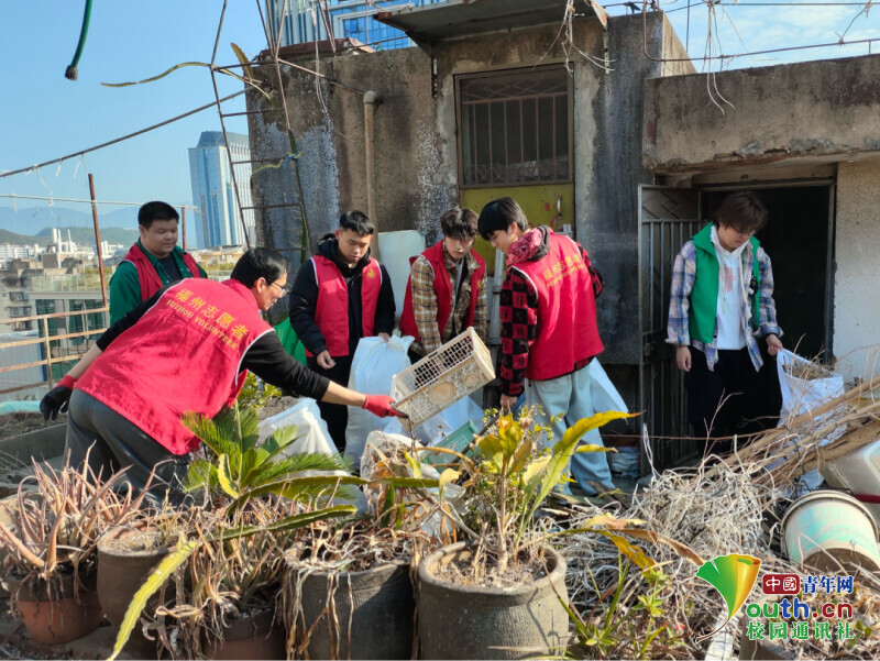 图为实践队员在居民楼顶清理堆放杂物。包梓薇 供图