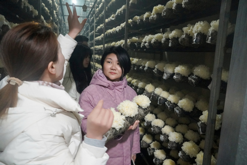 在宁德晟农无公害银耳生产基地,现代化菇房内雾气氤氲,雪白银耳长势喜人。企业依托恒温恒湿、智能新风、超声波雾化等技术,突破传统菇房半年生产的季节限制,实现银耳全年种植,产量翻倍增长。该企业还构建“科研+基地”协同发展模式,形成“技术输出—标准种植—订单收购”全产业链服务体系,直接带动周边300余户农户年均增收超5万元,让古田“小银耳”成为富民强村的“金耳朵”。队员们还现场聆听了“银耳姐姐”的返乡创业故事,感受乡村创新创业活力。