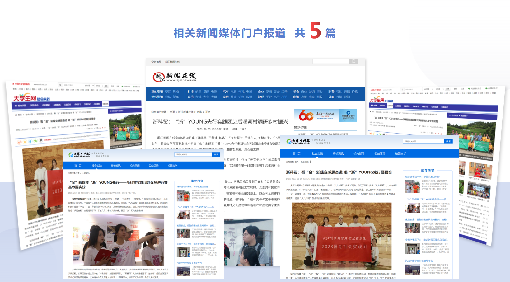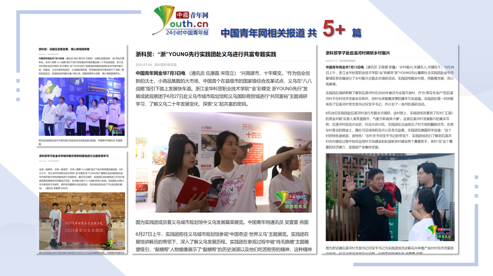 2023年6月,浙江金华科贸职业技术学院“金”彩蝶变 “浙”YOUNG先行发展成就观察实践团以青年人视角和“八八战略”同龄人看金华高质量发展20年蝶变,观察“八八战略”在金华的生动实践。在社会实践活动中上好“行走的思政课”,探索社会实践“四维感知、知行协同”育人新模式。
