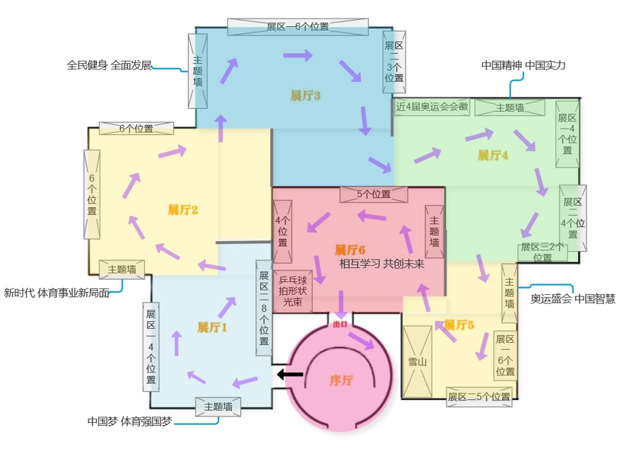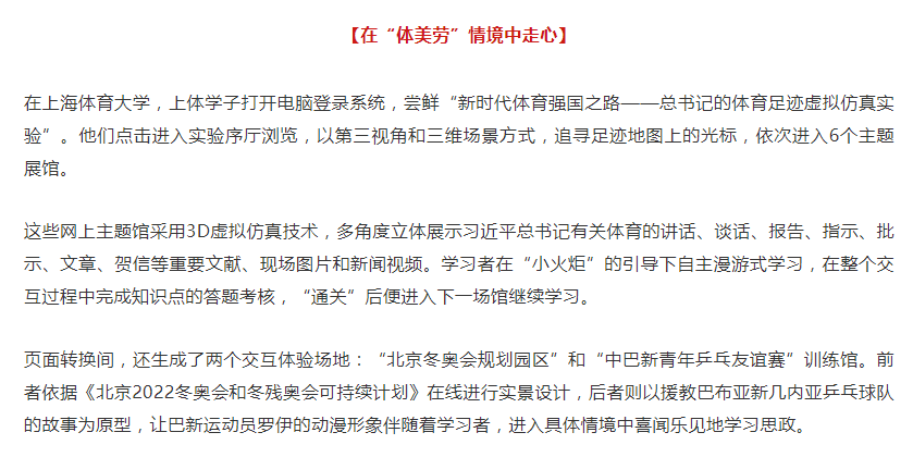 这些网上主题馆采用3D虚拟仿真技术,多角度立体展示习近平总书记有关体育的讲话、谈话、报告、指示、批示、文章、贺信等重要文献、现场图片和新闻视频。学习者在“小火炬”的引导下自主漫游式学习,在整个交互过程中完成知识点的答题考核,“通关”后便进入下一场馆继续学习。