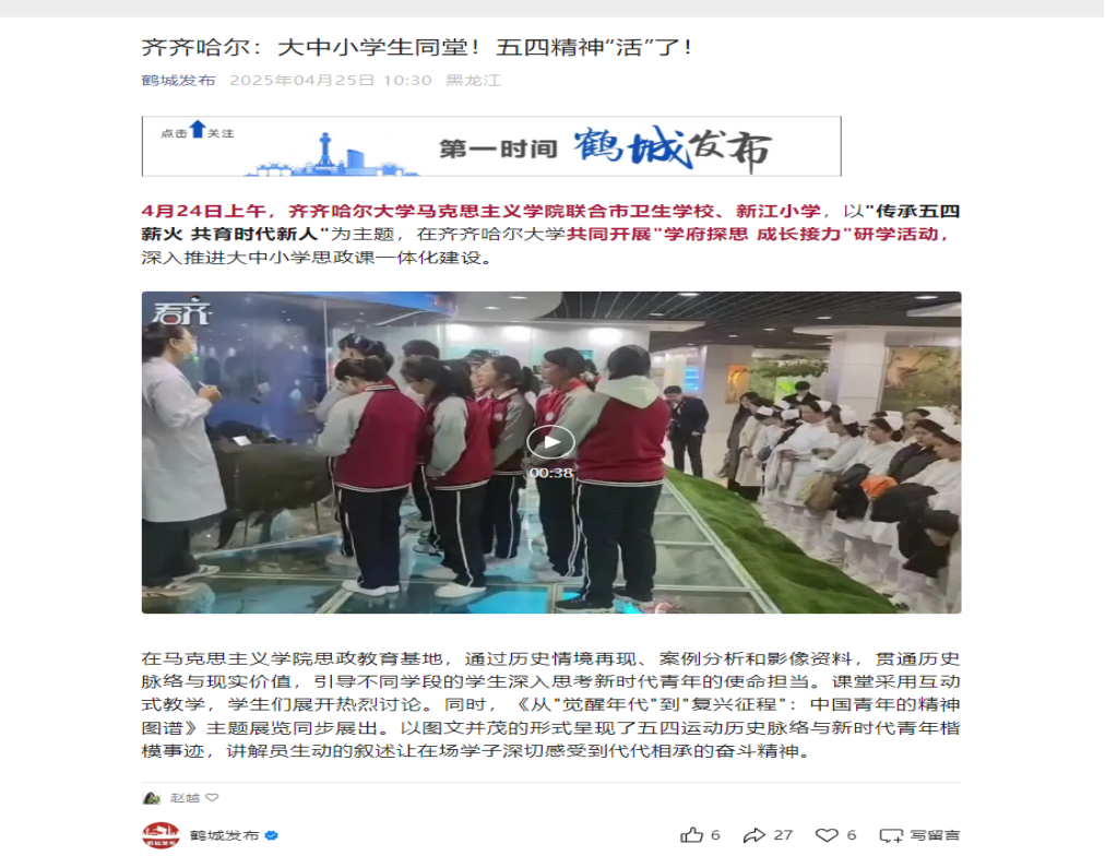 为深入推进区域大中小学思政课一体化建设,4月24日,在五四青年节到来之际,齐齐哈尔大学马克思主义思想政治理论课惟实励新教学团队联合齐齐哈尔市卫生学校、新江小学通过校际联动、学段贯通,共同举办了以“传承五四薪火 共育时代新人”为主题的大中小学思政课一体化实践教学活动,激发师生的爱国情怀与社会责任感。齐齐哈尔市新闻网等媒体进行了报道。
